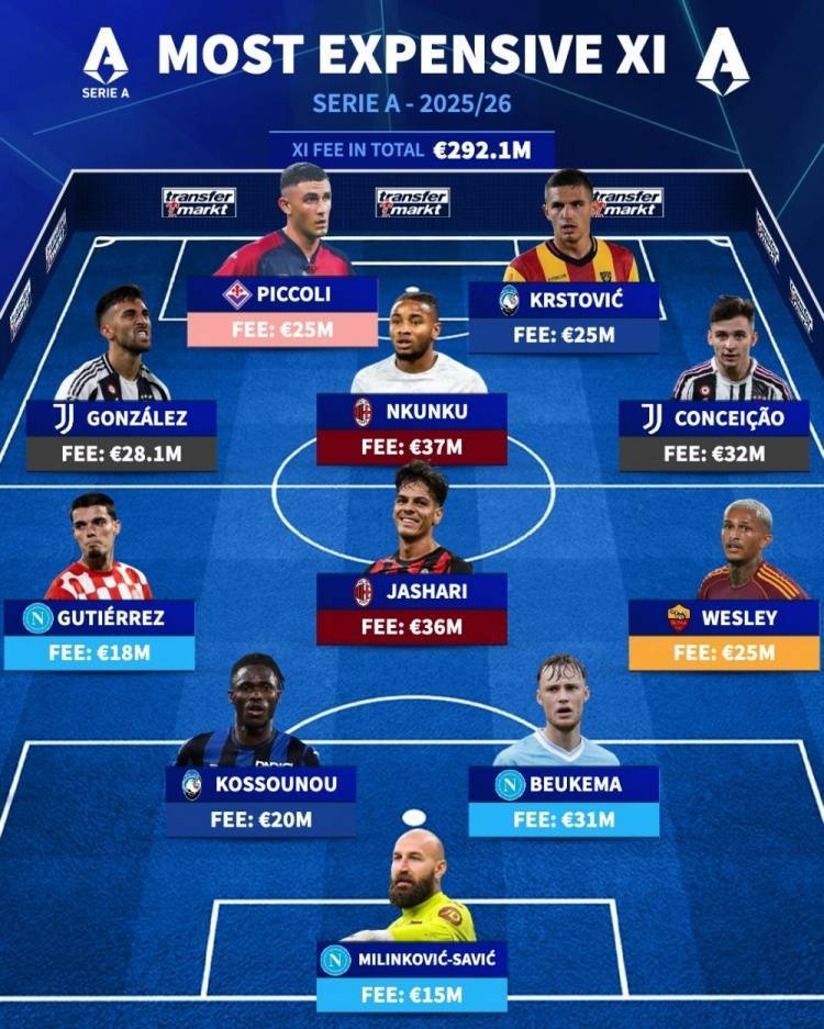 直播吧9月5日讯 德国转会市场列出了意甲今夏最贵签约阵容,恩昆库、亚沙里、小孔塞桑在列。